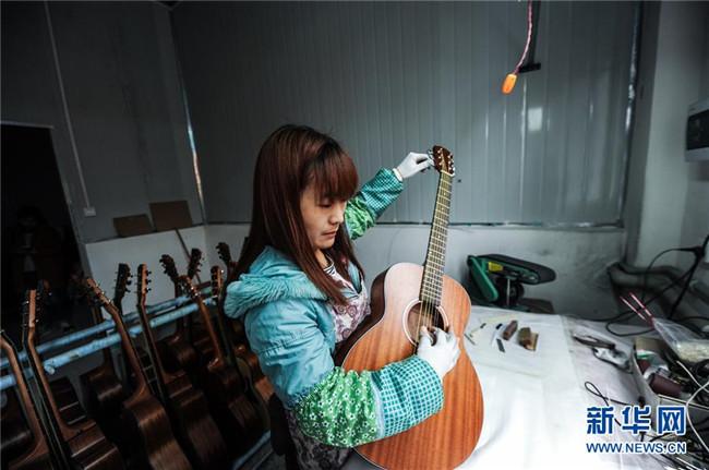調(diào)音師在貴州省正安縣“正安·國際吉他產(chǎn)業(yè)園”為吉他校對(duì)音準(zhǔn)(2017年3月28日攝)。新華社記者 陶亮 攝