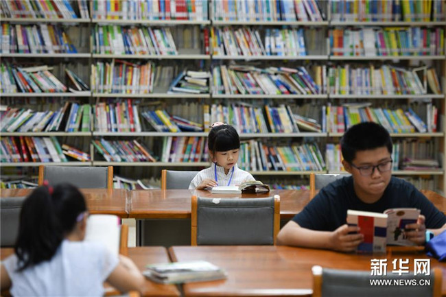 7月20日,孩子們?cè)诎不帐D書館看書。新華社記者 張端 攝