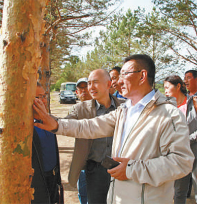 于??。ㄇ埃┡c苗木專家在察看林場(chǎng)樹(shù)木。新華社發(fā)