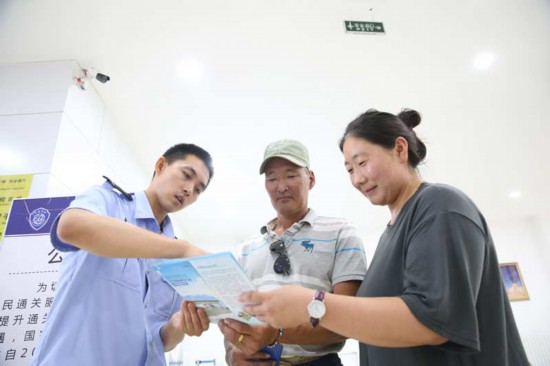 在滿都拉口岸,包頭出入境邊防檢查站執(zhí)勤業(yè)務(wù)科副科長宋強(qiáng)每天24小時帶著對講機(jī)。執(zhí)勤時,他的代號是“04”。