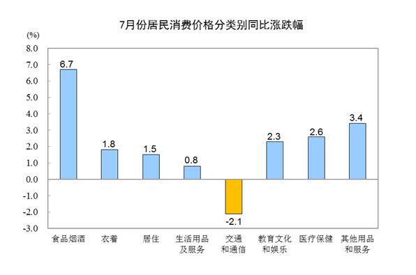 7月份,全國居民消費價格環(huán)比上漲0.4%。其中,城市上漲0.4%,農(nóng)村上漲0.3%;食品價格上漲0.9%,非食品價格上漲0.3%;消費品價格上漲0.2%,服務(wù)價格上漲0.7%。