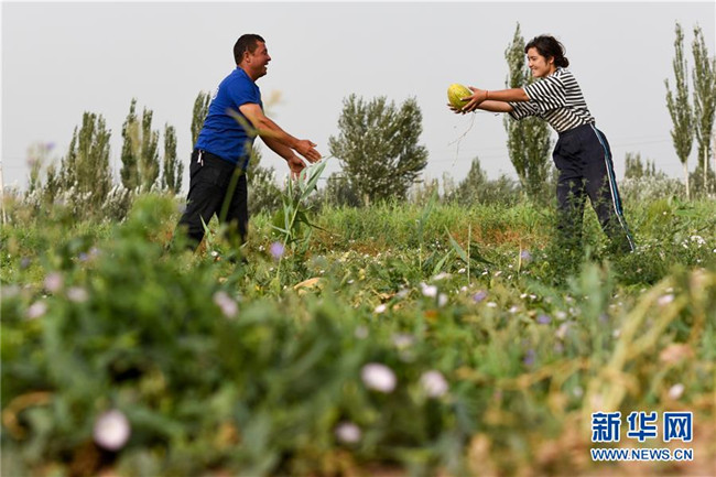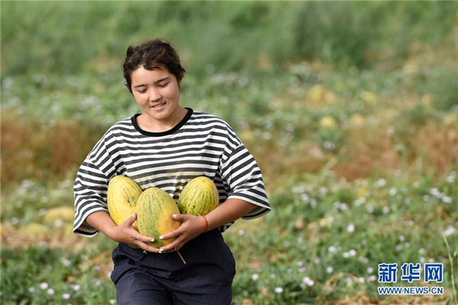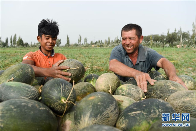 8月11日,在新疆伽師縣,瓜農(nóng)在采摘伽師瓜。新華社記者 丁磊 攝