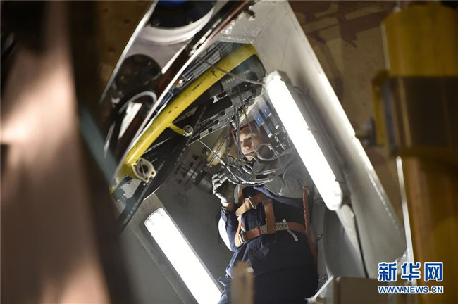 工人在沈陽(yáng)北方重工集團(tuán)一部在造的掘進(jìn)機(jī)內(nèi)部作業(yè)(2016年12月7日攝)。新華社記者 姚劍鋒 攝