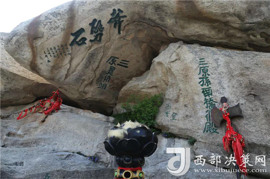 西峰上景觀比比皆是,有翠云宮、蓮花洞、巨靈足、斧劈石、舍身崖等,并伴有許多美麗的神話傳說(shuō)。峰上崖壁題刻遍布,工草隸篆,琳瑯滿目。峰北絕頂叫西石樓峰,峰上楊公塔為楊虎城將軍所建,塔上有楊虎城將軍親筆題辭。塔下巖石上有"枕破鴻蒙"題刻,是書(shū)法家王鐸手跡。