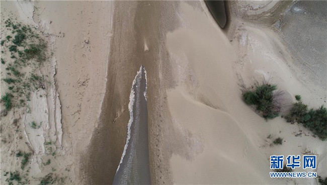 這是2019年實(shí)施的第20次向塔里木河下游生態(tài)輸水,水流在干涸的河床前行(8月25日無(wú)人機(jī)拍攝)。  新華社記者 阿曼 攝