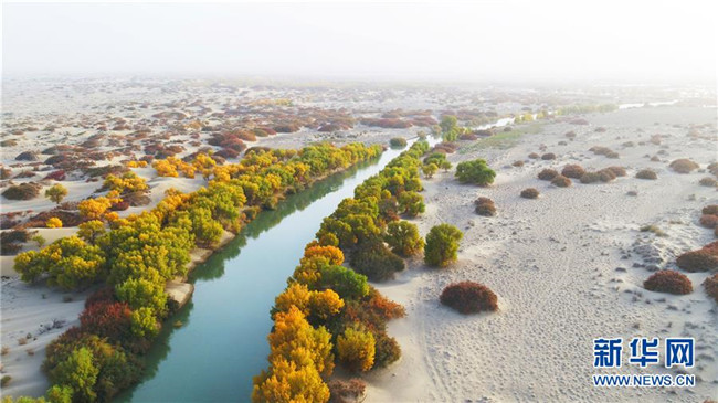 生態(tài)水滋養(yǎng)著塔里木河下游河道兩岸的胡楊,阻止了塔克拉瑪干與庫(kù)姆塔格兩大沙漠合攏(2017年10月15日無(wú)人機(jī)拍攝)。  新華社發(fā)(肖玉磊 攝)