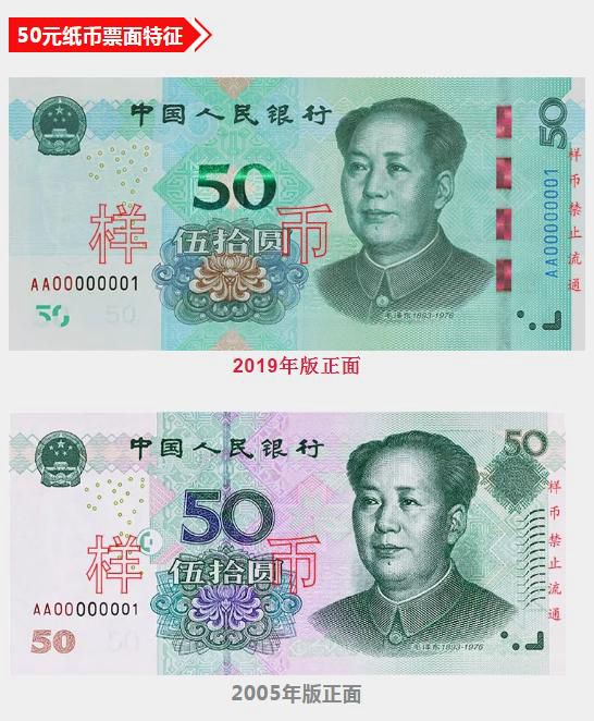 此外,2019年版第五套人民幣50元、20元、10元、1元紙幣調(diào)整正面毛澤東頭像、裝飾團(tuán)花、橫號碼、背面主景和正背面面額數(shù)字的樣式,增加正面左側(cè)裝飾紋樣,取消正面右側(cè)凹印手感線和背面右下角局部圖案,票面年號改為“2019年”。