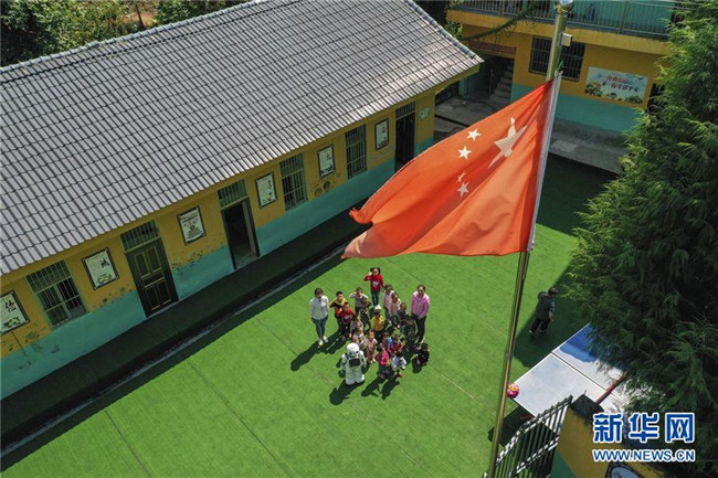 在城口縣蓼子鄉(xiāng)第一中心小學附屬的鄉(xiāng)村小學蓮花小學的開學典禮上,機器人老師和孩子們參加升國旗儀式(9月2日無人機拍攝)。 新華社記者 劉潺 攝
