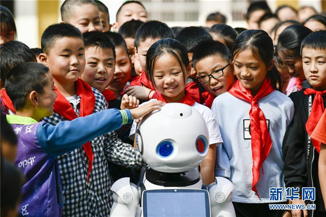 9月2日,在城口縣蓼子鄉(xiāng)第一中心小學開學典禮上,機器人老師和孩子們進行互動交流。  新華社記者 劉潺 攝