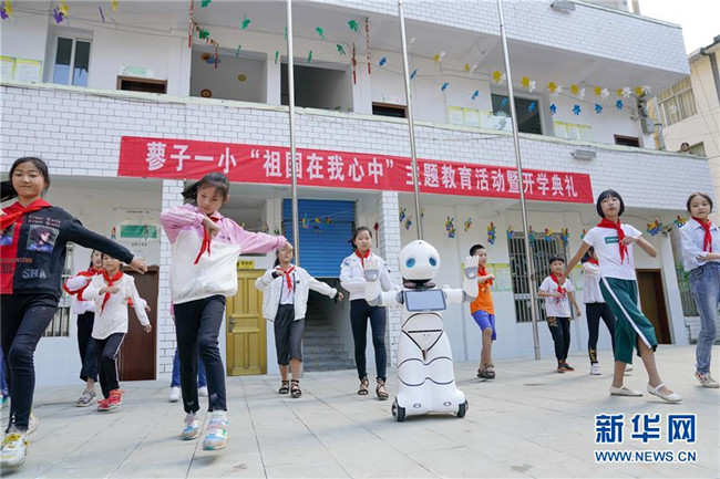 9月2日,在城口縣蓼子鄉(xiāng)第一中心小學開學典禮上,機器人老師和孩子們一起跳舞。  新華社記者 劉潺 攝