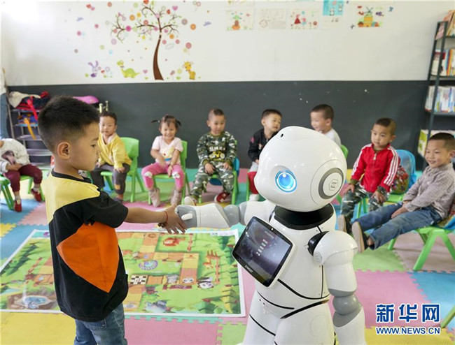 9月2日,在城口縣蓼子鄉(xiāng)第一中心小學開學典禮上,機器人老師在和孩子進行互動交流。 新華社記者 劉潺 攝