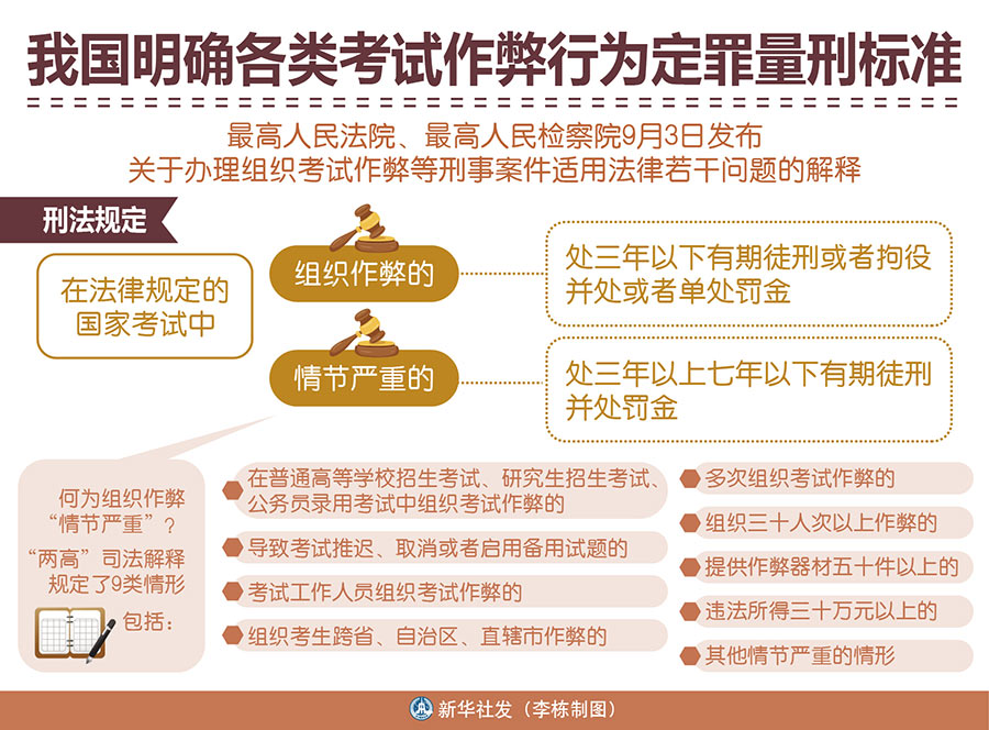 原標(biāo)題:明確定罪量刑標(biāo)準(zhǔn) 加大懲治力度——“兩高”發(fā)布考試作弊刑事案件司法解釋