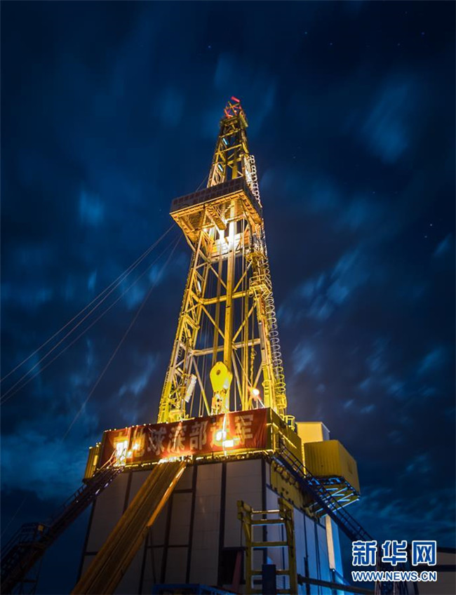 夜幕下的“地殼一號(hào)”萬(wàn)米鉆機(jī)整機(jī)系統(tǒng)(2018年6月1日攝)。2018年6月2日,吉林大學(xué)主要承擔(dān)研發(fā)的“地殼一號(hào)”萬(wàn)米鉆機(jī)正式宣布完成“首秀”:完鉆井深7018米,創(chuàng)造了亞洲國(guó)家大陸科學(xué)鉆井新紀(jì)錄,標(biāo)志著我國(guó)成為繼俄羅斯和德國(guó)之后,世界上第三個(gè)擁有實(shí)施萬(wàn)米大陸鉆探計(jì)劃專用裝備和相關(guān)技術(shù)的國(guó)家。 新華社記者 許暢 攝