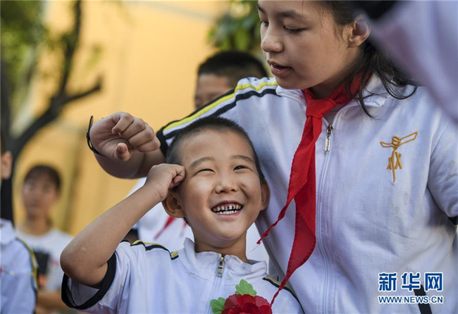 新學年伊始,新疆教育學院實驗小學舉辦主題為“夢想從這里啟航”的開學典禮,一年級新生在六年級學生的引領下培養(yǎng)愛學校、愛師長、愛學習的品德,走進校園開啟新生活。 新華社記者 王菲 攝
