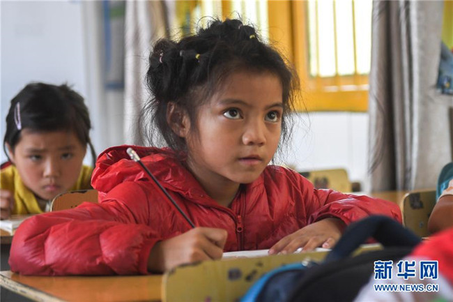 十八洞小學(xué)一年級學(xué)生施蓉婭在上課時認(rèn)真聽講(9月4日攝)。新華社記者 陳澤國 攝