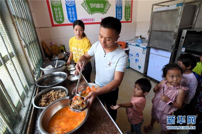 9月5日,十八洞小學(xué)學(xué)生在排隊等候老師盛飯菜。新華社記者 陳澤國 攝