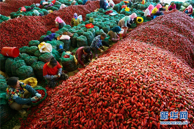 這是近日在甘肅省高臺縣拍攝的辣椒分揀、挑選場景。時下,高臺縣宣化鎮(zhèn)和駱駝城鎮(zhèn)種植的1700畝墨西哥辣椒進入采摘和收購期,火紅的辣椒堆積如山,映紅了農(nóng)民的笑臉。新華網(wǎng)發(fā)(鄭耀德 攝)