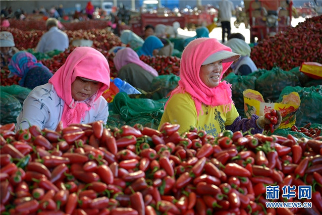 甘肅高臺千畝辣椒獲豐收 堆積如山紅似火