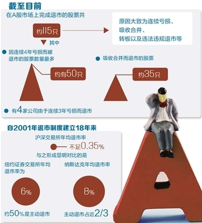 自2001年退市制度建立18年來,滬深交易所年均退市率依舊不足0.35%,主動退市更是少之又少,遠不能保障A股進出平衡。與之形成鮮明對比的是,紐約證券交易所年均退市率為6%,約50%是主動退市;納斯達克年均退市率8%,主動退市占近2/3,而A股市場則大多是被動退市,極少有主動退市的情況。