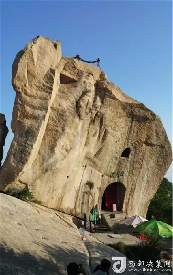 華山以石著名,每一處奇石都有一個(gè)美麗而動(dòng)人的傳說(shuō)。過(guò)了擦耳崖,看到的這兩塊石頭叫“日月巖”,左邊的代表“日”,右邊的代表“月”,上面這四個(gè)字是“云天弧光”,有時(shí)在夜晚,這里會(huì)出現(xiàn)一道非常耀眼的光。相傳武則天當(dāng)年上華山走這里,看到這兩塊形似日月的石頭,就別出心栽地給自個(gè)兒的字號(hào)創(chuàng)造了一個(gè)“瞾”字,因?yàn)檫@兩塊奇石上頂青天,下臨空谷,唯我獨(dú)尊,是光明與權(quán)威的象征。