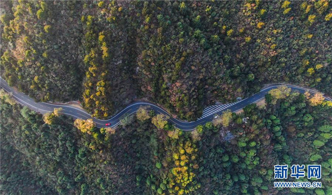 車輛行駛在通往廬山風(fēng)景區(qū)的北山公路上(10月9日無(wú)人機(jī)拍攝)。新華社記者 胡晨歡 攝