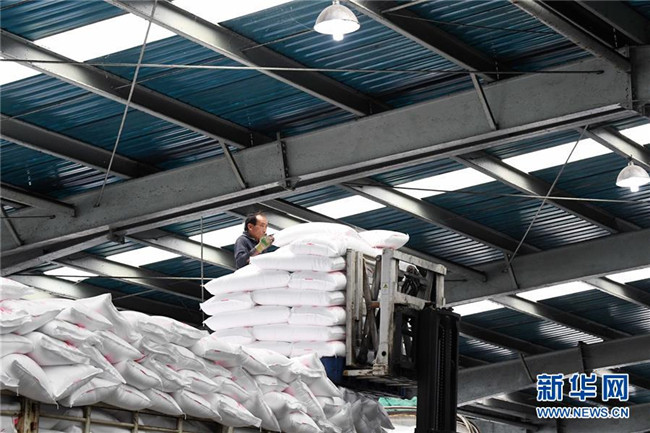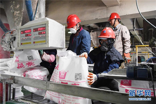 10月14日,轉(zhuǎn)移就業(yè)的農(nóng)民在云南省曲靖市沾益區(qū)花山街道勞務中心尿素包裝裝卸車間工作。