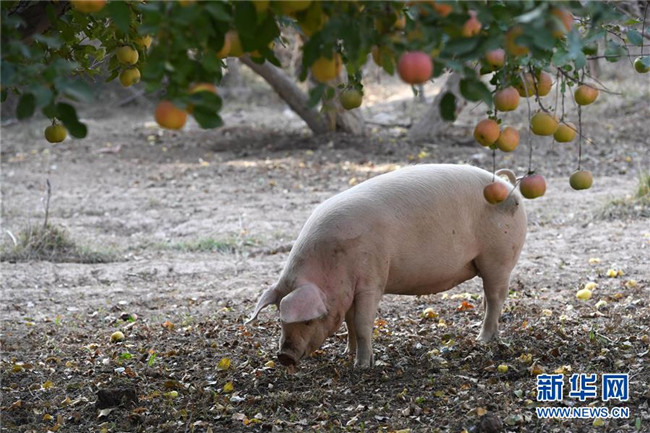 10月24日,在敦煌市郭家堡鎮(zhèn)一處果園,一頭豬在果樹下覓食。新華社記者 馬寧 攝