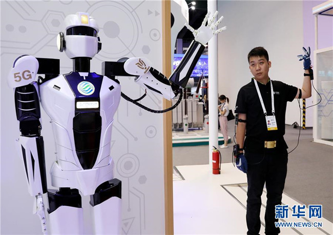 一名工作人員(右)在上海舉行的2019世界人工智能大會上演示一款基于5G網(wǎng)絡(luò)實現(xiàn)遠程控制的機器人(8月29日攝)。新華社記者 方喆攝