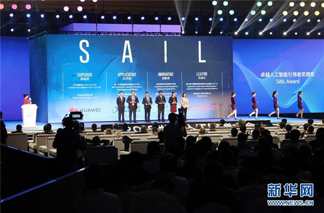 在上海舉行的2019世界人工智能大會開幕式上,獲得卓越人工智能引領(lǐng)者獎的企業(yè)代表合影(8月29日攝)。新華社記者 方喆攝