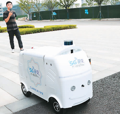 在江蘇南京江北新區(qū)國(guó)際健康城,無(wú)人配送車(chē)在送貨途中自主決策躲避障礙。新華社記者 李雨澤攝 |