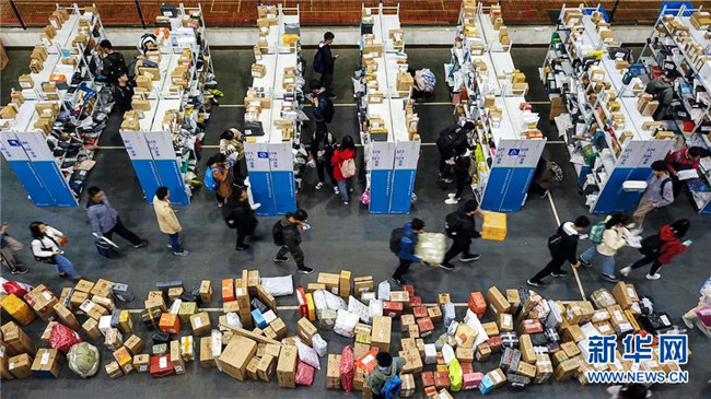 南京航空航天大學師生在校園臨時快遞取件點領取快遞(2018年11月13日攝)。為應對“雙十一”大量校園快遞包裹,南京航空航天大學在原“快遞超市”的基礎上,將學校體育中心室內網(wǎng)球場搭建為臨時快遞取件點,方便在校師生取件。新華社記者 李博 攝