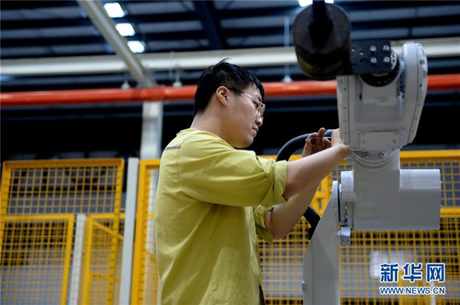 在蕪湖機(jī)器人產(chǎn)業(yè)園,工作人員在預(yù)裝埃夫特六關(guān)節(jié)機(jī)器人零部件(10月21日攝)。 新華社發(fā)(黃博涵攝)