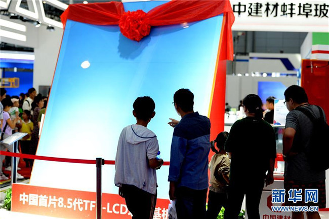 觀眾在2019世界制造業(yè)大會(huì)上參觀中國(guó)首片8.5代TFT-LCD玻璃基板(9月22日攝)。 新華社發(fā)(黃博涵攝)
