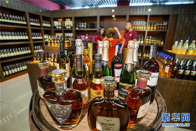 在中哈霍爾果斯國際邊境合作中心,游客在一家哈薩克斯坦酒商開設(shè)的店鋪里選酒(7月11日攝)。新華社記者 趙戈 攝
