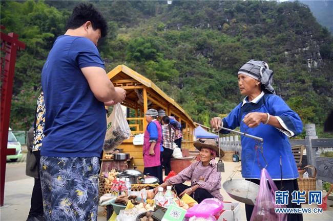 這是廣西凌云縣浩坤村群眾在景區(qū)擺放水果等食品接待游客(11月24日攝)。新華社記者張愛林