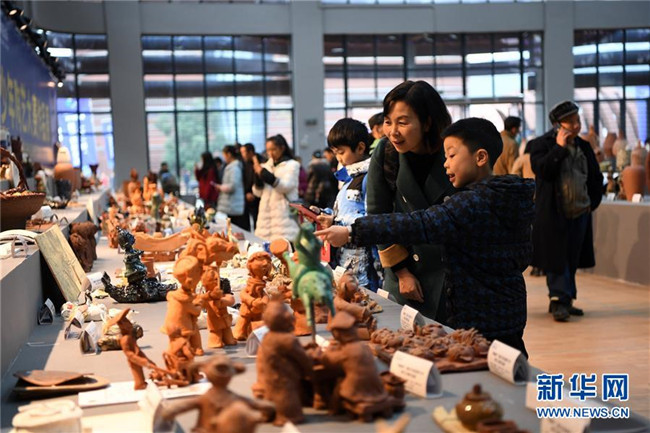 12月1日,一對母子在陶藝技能大賽現(xiàn)場參觀參賽作品。新華社記者唐奕攝