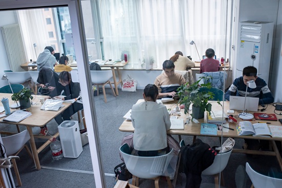 11月22日,袁翊宸在北京中關(guān)村的一家付費(fèi)自習(xí)室中學(xué)習(xí)。從5月開(kāi)始,他每天乘坐40分鐘的公交車(chē)來(lái)到這家自習(xí)室,備考北大金融專(zhuān)業(yè)的研究生。