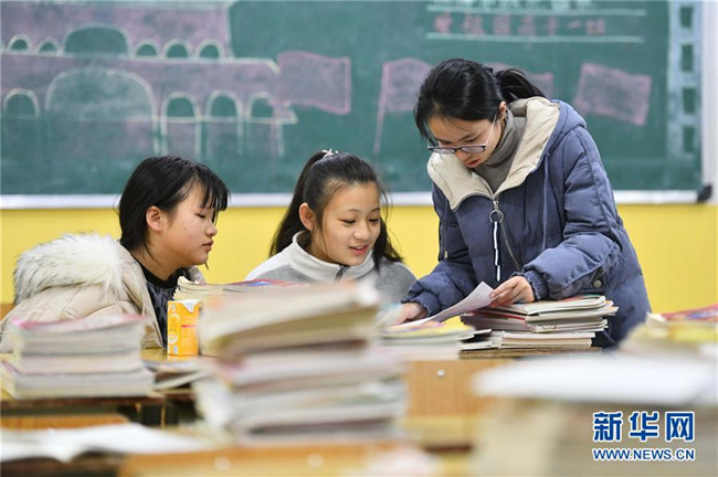 12月5日,在廣西融水苗族自治縣民族中學(xué),胡欣怡(右)在給學(xué)生輔導(dǎo)功課。胡欣怡是西北工業(yè)大學(xué)的在讀碩士研究生,今年9月來到融水苗族自治縣民族中學(xué),擔(dān)任語文老師。 新華社記者 黃孝邦 攝