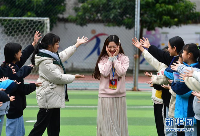 12月5日,在廣西融水苗族自治縣保桓中學(xué),林洋港(右三)和學(xué)生們在球場上玩游戲。林洋港是西北工業(yè)大學(xué)的在讀碩士研究生,今年9月來到融水苗族自治縣?;钢袑W(xué)任物理老師。新華社記者 黃孝邦 攝