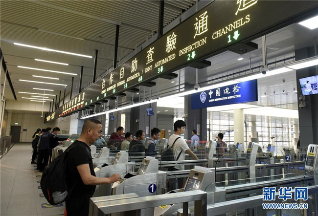 在港珠澳大橋澳門(mén)邊檢大樓,旅客從自助查驗(yàn)通道通關(guān)去往廣東珠海(11月21日攝)。新華社記者 徐亮 攝