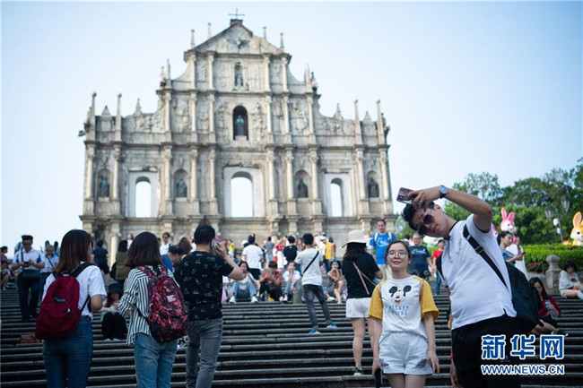 10月8日,人們?cè)诎拈T(mén)大三巴牌坊前游覽。新華社記者 張金加 攝