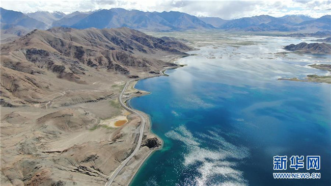 2019年8月3日拍攝的位于西藏阿里地區(qū)境內(nèi)的班公湖畔的公路(無(wú)人機(jī)照片)。 新華社記者 晉美多吉 攝