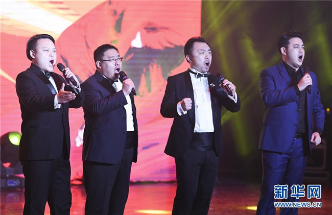 1月12日,中央歌劇院文藝小分隊(duì)志愿者在慰問演出上表演男聲四重唱。新華社記者 王全超 攝