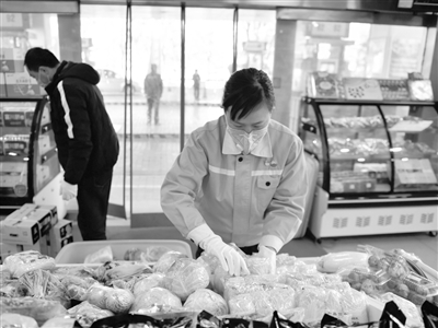 2月3日,中國(guó)石油天然氣股份有限公司青海西寧銷售分公司市區(qū)五四網(wǎng)點(diǎn)工作人員在貨架上整理蔬菜。