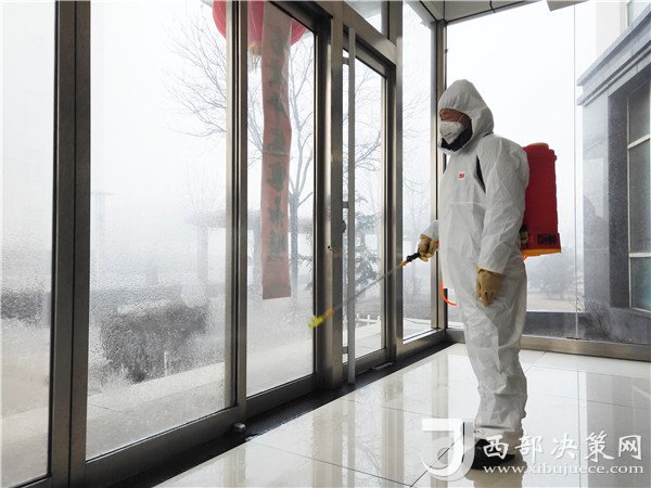 立春后的早晨,草地上仍然附著一層白茫茫的冰霜。陜北礦業(yè)檸條塔公司的公寓樓大廳里,武存照身穿白色防護(hù)服,手拎消毒箱,一邊默默地噴灑著刺鼻的84消毒水,一邊目不轉(zhuǎn)睛地盯著腳下,生怕漏掉一個(gè)角落。