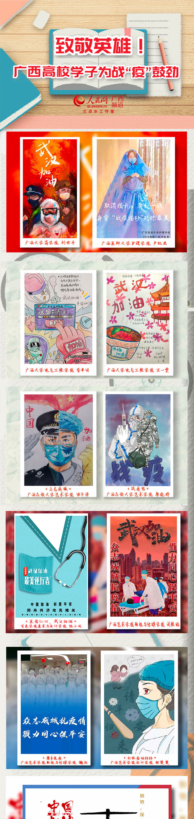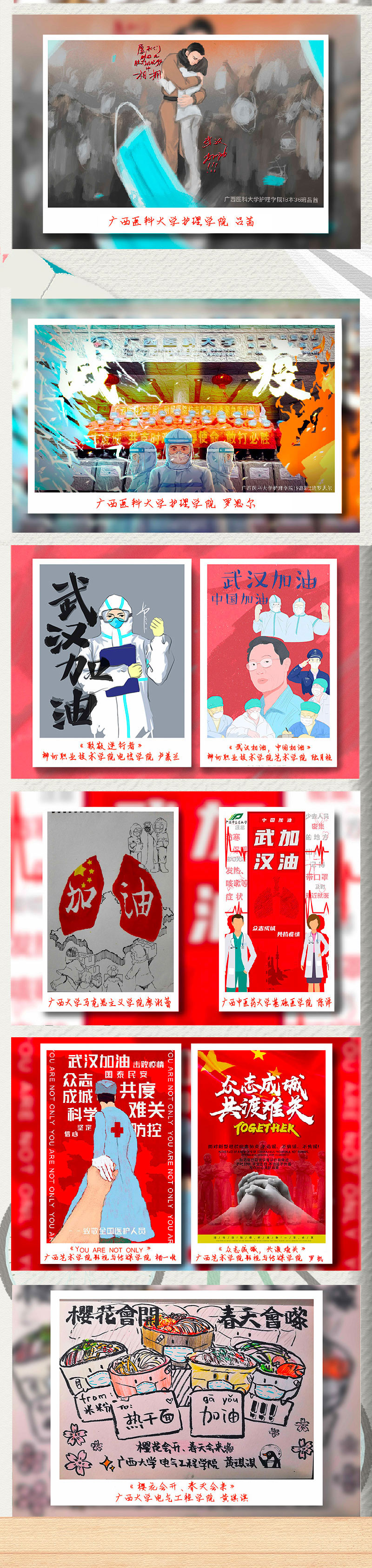 廣西各大高校的青年學(xué)子心系“疫”線,以抗擊疫情為主題創(chuàng)作了一批鼓舞人心的公益作品,向逆行英雄致敬,鼓勵(lì)人們積極樂觀面對(duì)疫情,以頑強(qiáng)意志、必勝信念打贏疫情阻擊戰(zhàn)。(彭遠(yuǎn)賀、實(shí)習(xí)生溫嘉康)
