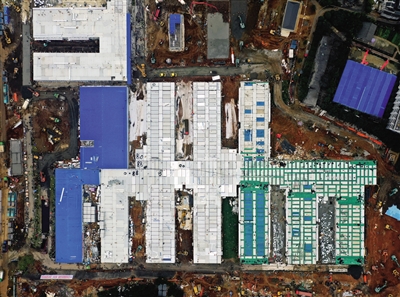 在武漢火神山、雷神山醫(yī)院建設(shè)中,基于北斗衛(wèi)星導(dǎo)航系統(tǒng)的高精度定位設(shè)備火速馳援,確保工地大部分放線測(cè)量一次完成。這是無(wú)人機(jī)拍攝的武漢火神山醫(yī)院。記者 李賀 攝
