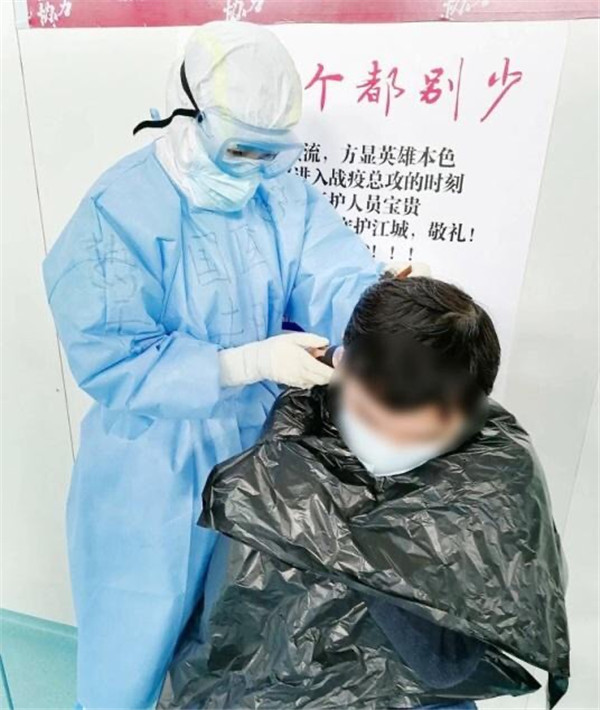 1艙有康復(fù)人員想理發(fā),手頭沒有工具,朱晴護(hù)士長得知后,聯(lián)系下個班次護(hù)士帶來推子,給大家理發(fā)。“看你動作很嫻熟啊,以前練過的吧”,“圍觀群眾”打趣道。“現(xiàn)學(xué)現(xiàn)賣,大家要求不要太高,有壓力??!”朱晴說。一直推到推子沒電,朱晴給6位康復(fù)人員簡單修剪了頭發(fā)。得知朱晴是西安醫(yī)療隊的護(hù)士,大家都親切的稱她“肉夾饃”!