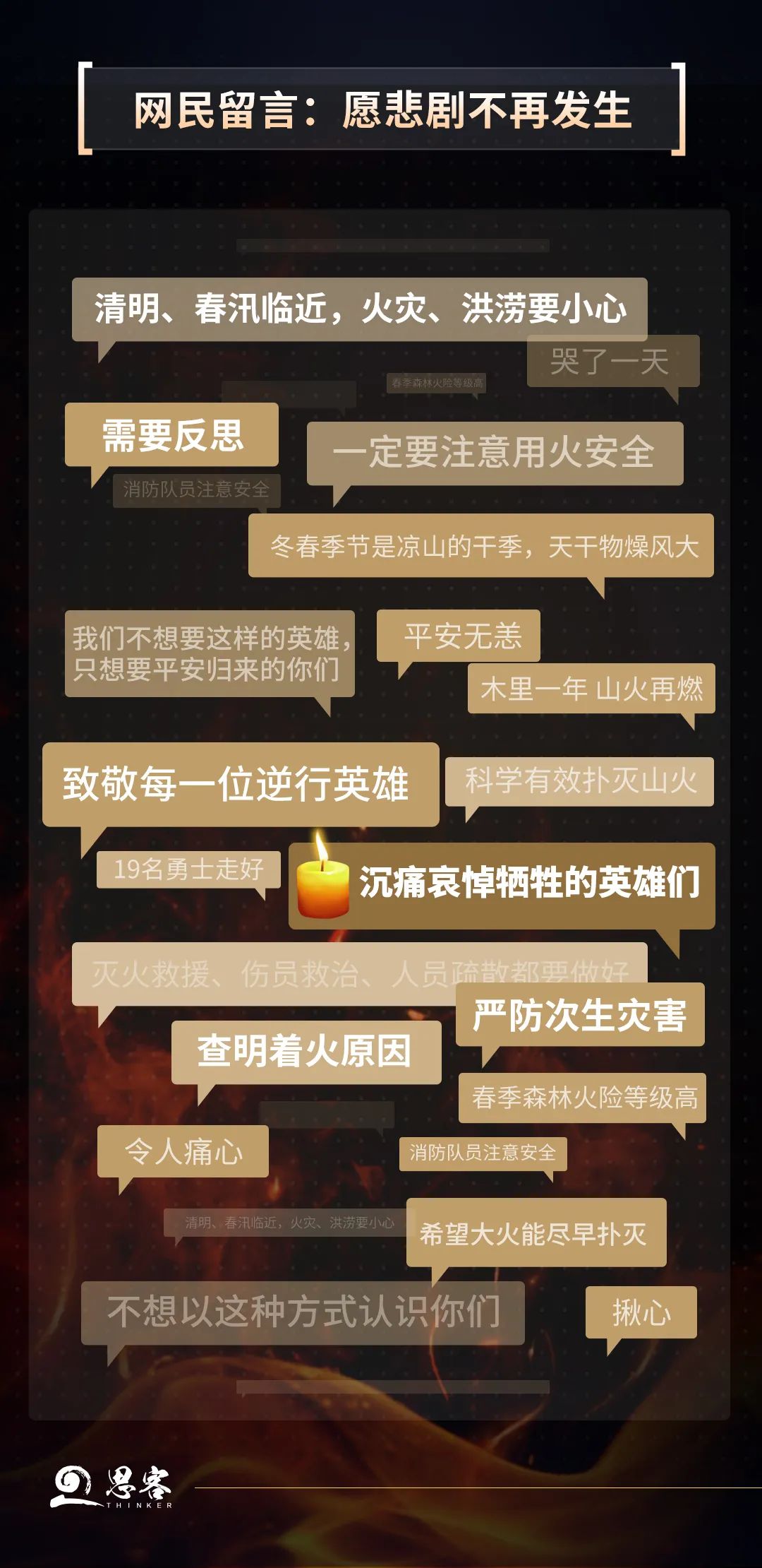“火災”“英雄”“反思”是網(wǎng)民留言中的高頻詞,“我們不想要這樣的英雄,只想要平安歸來的你們”成為網(wǎng)民共同心聲。逆火而行的英雄值得尊敬,但確保撲火人員安全更是前提。有網(wǎng)民說,一年前,四川木里的那場大火,造成31人不幸犧牲;一年后,又是一場大火,再次奪走19條鮮活的生命。春天天干物燥、山火肆虐蔓延、風向突然變化,兩次火災場景何其相似。我們需要認真反思,加大對風向突變的預判,利用更多科技手段滅火,避免火災“風”險悲劇重演。