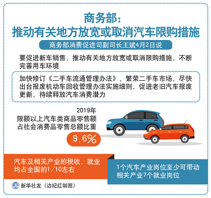 商務(wù)部消費促進司副司長王斌2日說,要促進新車銷售,推動有關(guān)地方放寬或取消限購措施,不斷完善用車環(huán)境,加快修訂《二手車流通管理辦法》,繁榮二手車市場,盡快出臺報廢機動車回收管理辦法實施細則,促進老舊汽車報廢更新,持續(xù)釋放汽車消費潛力。